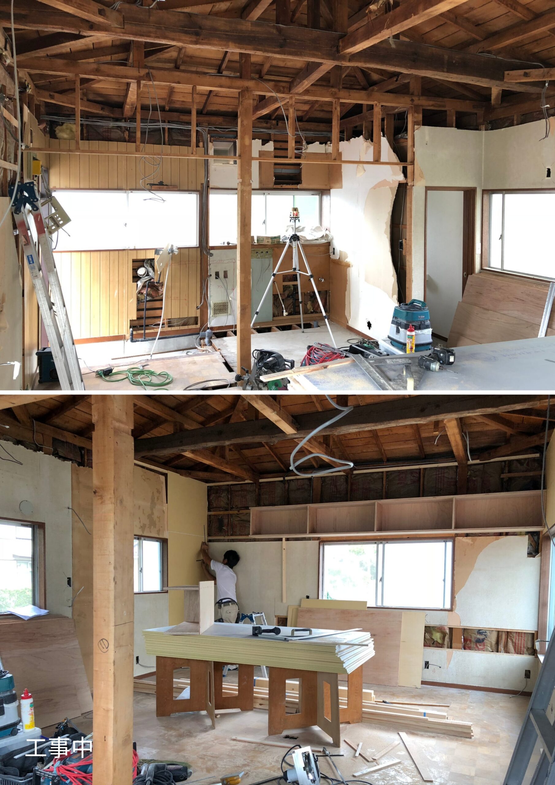 開放的にするために既存の天井を壊したところ、美しい梁と上棟祝いの幣串が現れました。 -