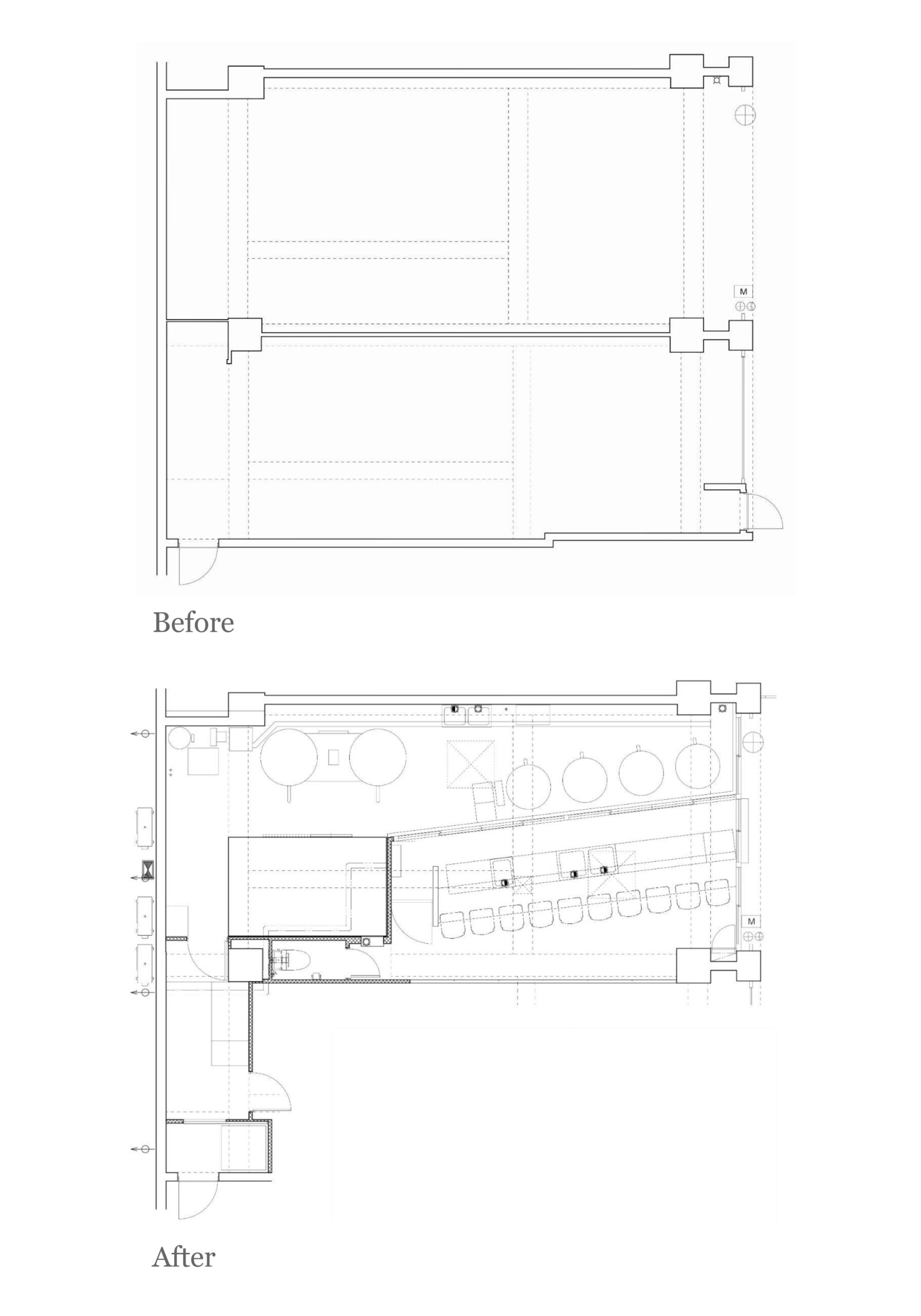 来店客には、ここがただのビールバーではなくビール醸造所であり、まさにここで造っているということをビールとともに味わってもらいたいという思いから、客席と醸造所ビールタンクを対面する位置関係にし設計しています。